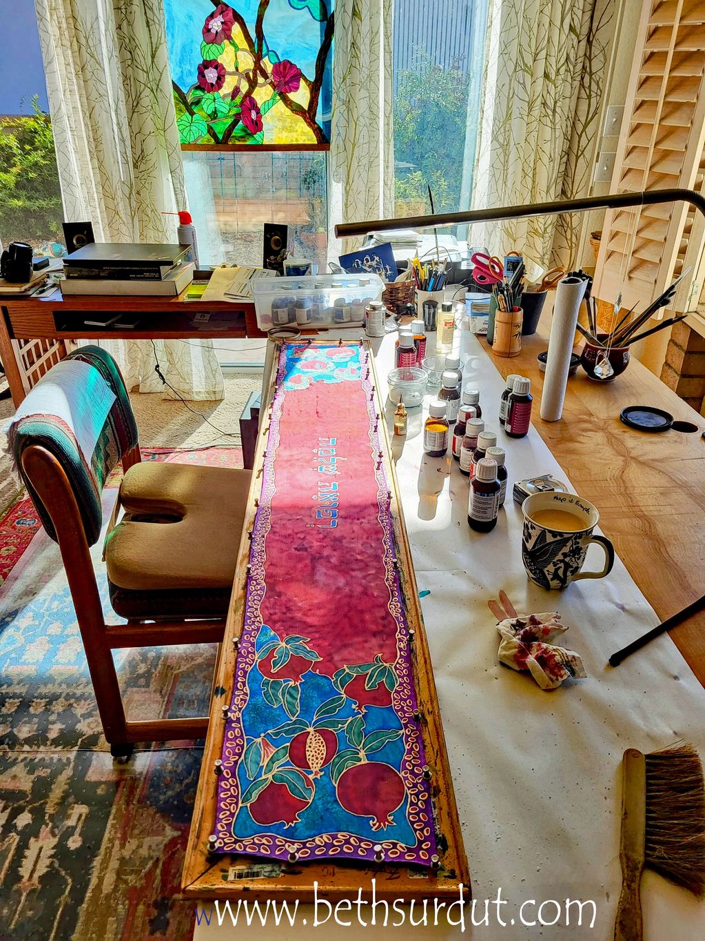 When my Ukrainian grandfather was 18 years old, his two brothers, studying to be Torah scribes, were murdered by Cossacks. He came to America in 1905 and fathered 3 sons. Designing prayer shawls, chuppahs, Torah covers, and healing scarves is a way to say Kaddish for family members each time I hand letter a prayer.