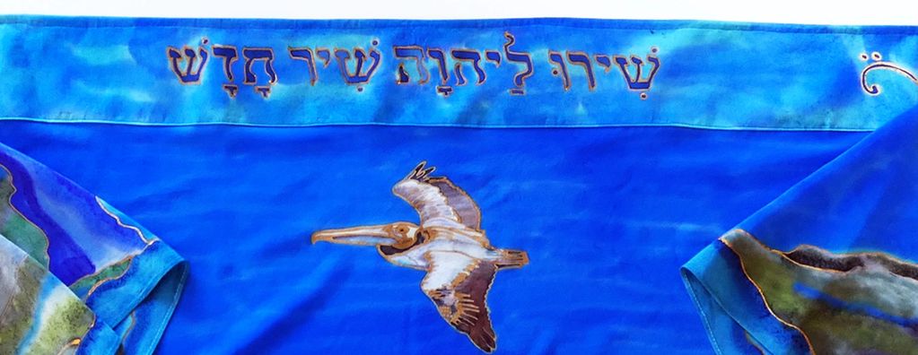 "Sing unto God a new song." Beauty soars and swims in this prayer shawl inspired by the client's favorite places and animals, including seals a pelicans.