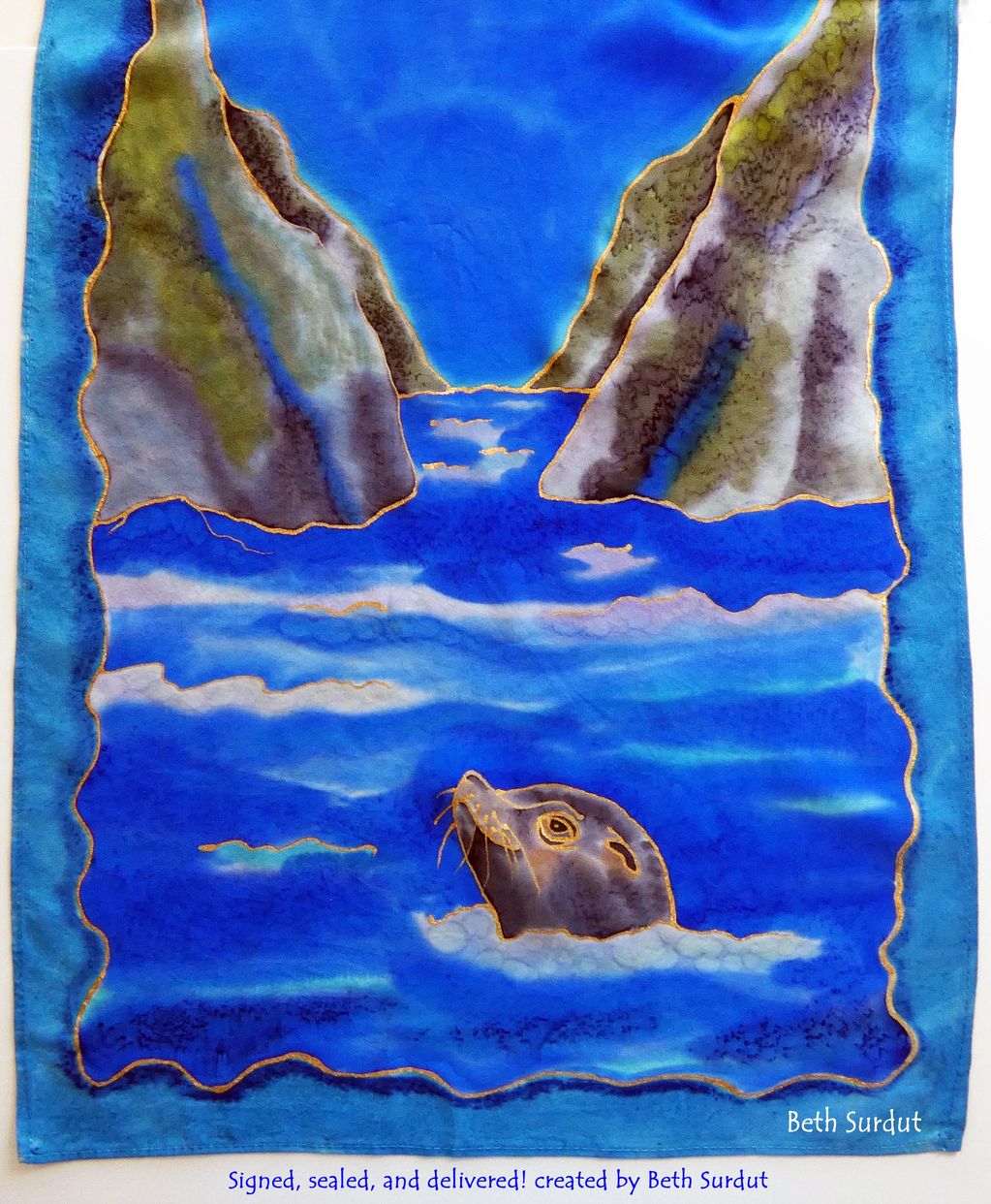 We all need a safe place, a sanctuary from the incessant news. When people find out that I am happy to include animals in these spirit scarves, I am given the opportunity to paint new creatures and places, real and imagined.For this client, I included the seals at La Jolla cove and Norwegian fjords.