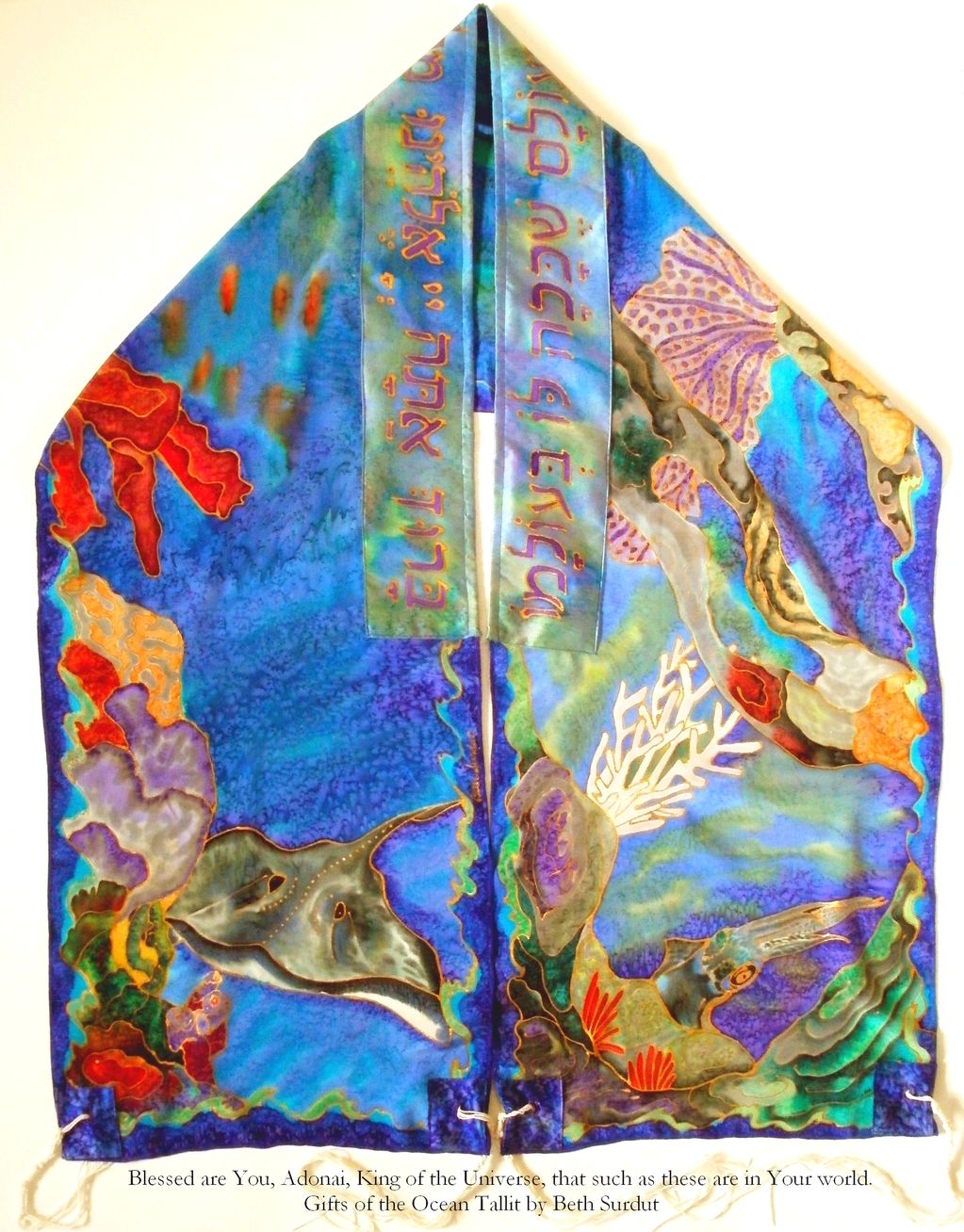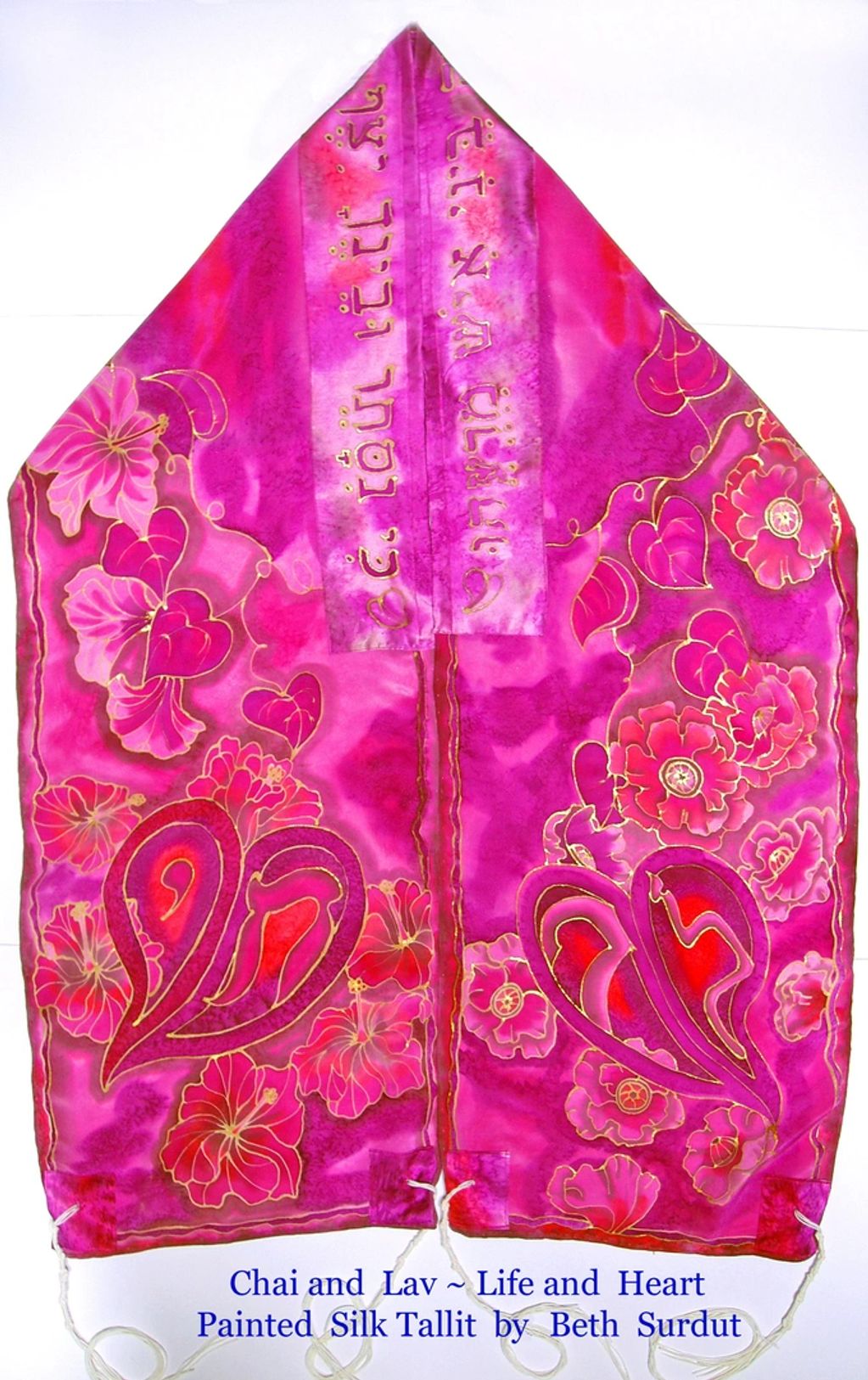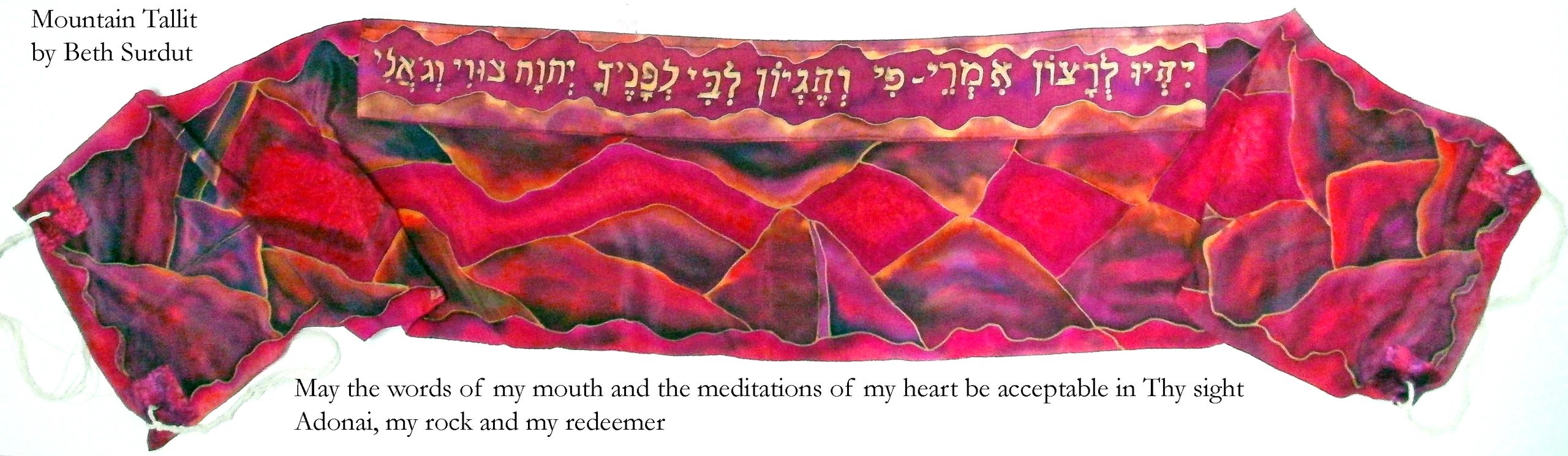 I see a prayer shawl as an invitation to step out of the chatter of daily life and into a meditative space.To create your portable house of prayer, we work together to find the words, colors , and forms that call to you to open your inner spirit. Designs and prayers are drawn with gold-flaked resist onto 14" x 72" luscious white sand-washed crepe de chine silk. Elegant silk charmeuse, which has a pearlescent glow, is used for the atarah and corners. Each separate piece is painted with fiber-reactive dyes, then steamed for hours to set the dyes. After washing, cutting, and sewing the elements into place, wool tztzit strings from Israel are tied in a traditional gematria of knots and wraps that numerically translate as "God is One."