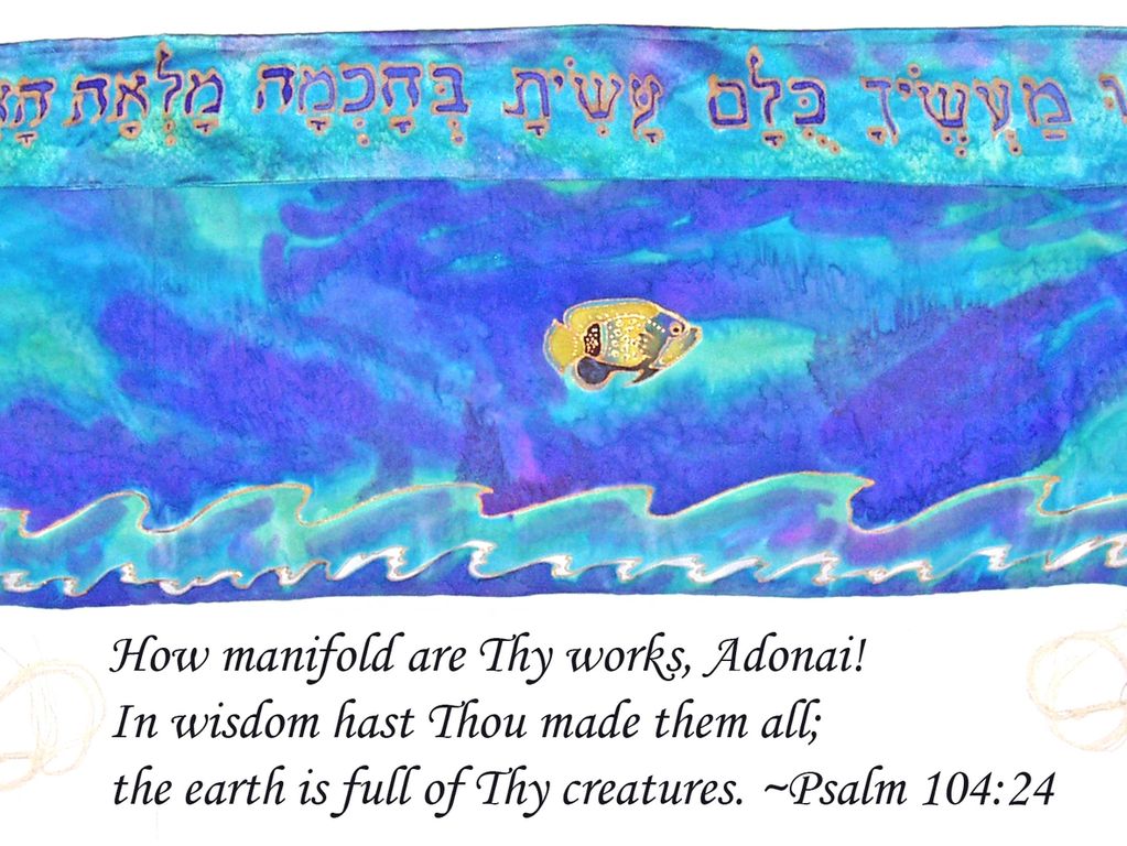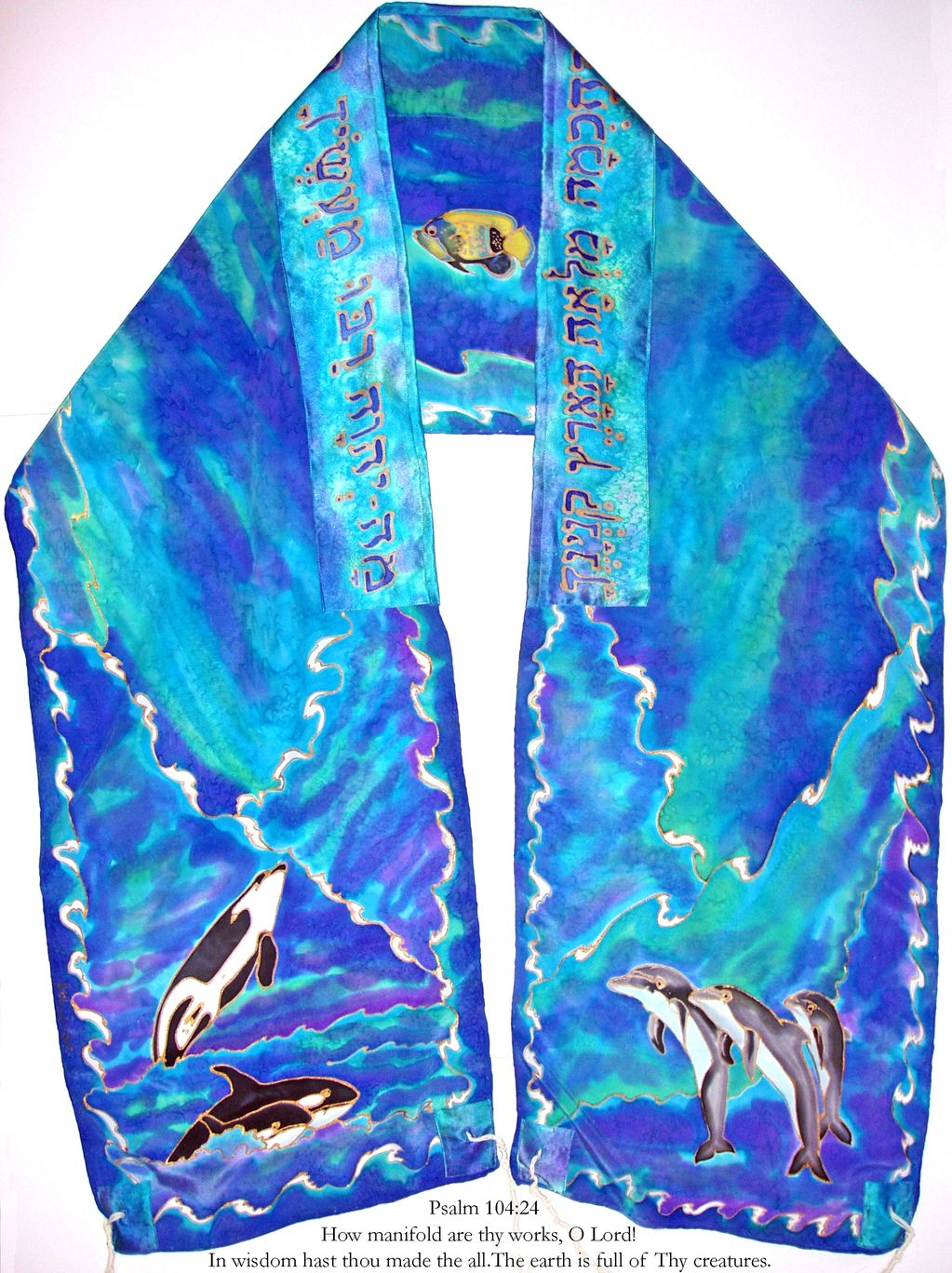Psalm104:24 How manifold are Thy works, O the Lord! In wisdom hast Thou made them all; the earth is full of Thy creatures. Designed for a budding marine biologist who expressly asked for dolphins and orcas. These animals do not live harmoniously, yet here, they happily cavort, each on separate parts of an ocean. I painted an agelfish in the center, because everyone needs an angel at their back.